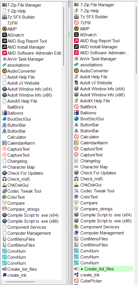 106800Добавлена возможность для перетягивания из программ с низшими правами в проги с высшими правами (Не проверено). 106800Увеличена на порядок скорость отображения списка программ (через WinApi). Если будешь пробовать с большим списком, попробуй при клике категории сразу после очистки LV выполнить выделение памяти по размеру всего списка прог. Да это будет больше нужного, ведь заранее неизвестно сколько пунктов для текущей категории, но думаю там мало выделяется памяти и если будет выделено чуть больше, ничего не пострадает. #LVSICF_NOINVALIDATEALL = 1 #LVSICF_NOSCROLL = 2 SendMessage_(GadgetID(#LIG_Program), #LVM_SETITEMCOUNT, ListSize(Program()), #LVSICF_NOINVALIDATEALL | #LVSICF_NOSCROLL) Обрати внимание на смазывание значков.