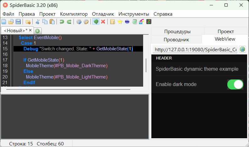 SpiderBasic.prefs - файл настройки с чёрной темой в папке C:\Users\user\AppData\Roaming\SpiderBasic\ или /home/user/.spiderbasic/.