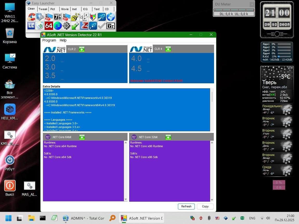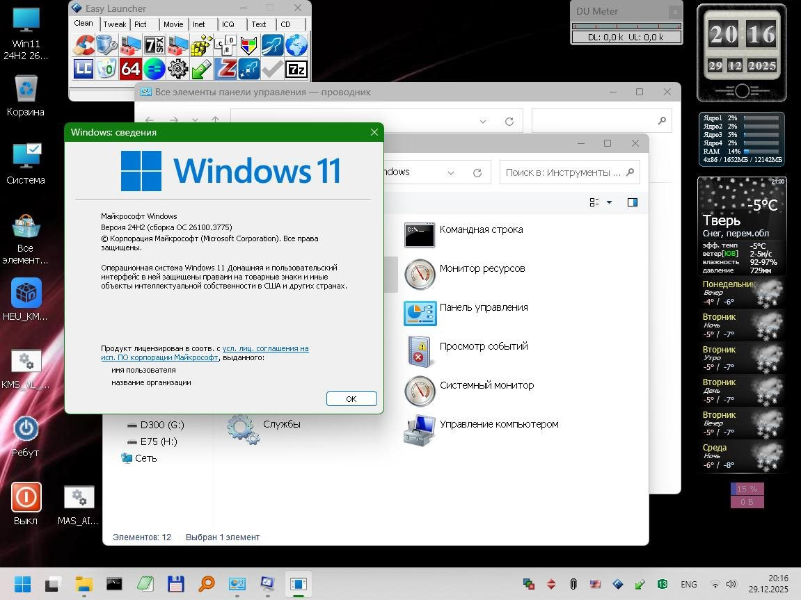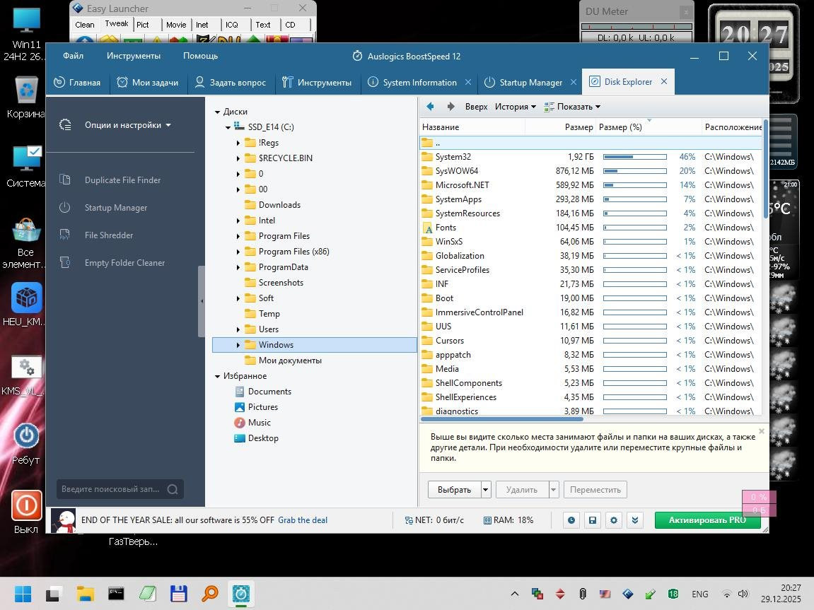 Windows 11 24H2 [26100.3775] - 1GB В процессе настройки обнаружился один баг - система внезапно заморгала и заверещала о "переполнении стека", виной которого является Shellhost.exe. Загрузкой в PE нашел и занулил (через Unlocker'a добавил 0 к расширению) этот модуль и все заморочки закончились, система заработала стабильно и шустро. А вот вернуть вид индикатора громкости к семерочному вертикальному виду так и не получилось, увы, как ни старался. AeroTweaker с этим не справился.