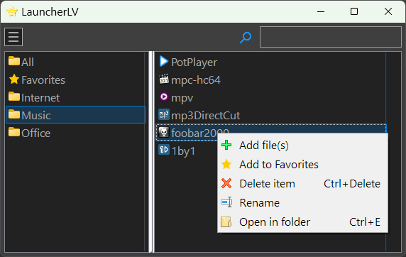 106675 -font_size = 10 - не понял как работает этот параметр, меняю нечего не изменяется; -может чего то не заметил в описание, но какие горячие клавиши лаунчер из трей меню открывать; -в трей меню неплохо б добавить чтоб и меню избранное отображалось бы тоже; Добавил это, просто не хотел второстепенными для меня вещами пока забивать код, кто знает может придётся ещё раз структуру списка менять, но вероятнее уже нет. font_size = 0 - делает шрифт по умолчанию как в текущей ОС, иначе доступны значения от 8 до 22 HotkeyShow = Ctrl+Space - хоткей указывается текстом, библиотека добавила +10 кб чтобы распарсить текст в код, поэтому я не хотел торопиться добавлять это и придумать что-то упрощённое. Если хоткей задать жёстко или кодом, который не понятно для пользователя как получить, то +10 кб отменяется. При вводе в поле поиска строчные - поиск везде, с заглавной буквы - поиск от начала. Добавлен пункт "Справка", но при условии если есть файл справки LauncherLV.chm Добавлен пункт "Информация" Добавлен пункт "Изменить параметры запуска", чтобы не искать вручную. Добавлено/исправлено перетаскивание в "Избранное", в "Без категории", в "Все". Последние два стирают категорию Добавлен флаг AutoAddCtgr = 1, автоматически добавляет категорию, если она указана для программы, но её нет в категориях Кто не в курсе, пока форум не работал было много вещей добавлено в LauncherLV: 1. Пункты: "Импорт программ из меню Пуск". 2. Иконки для категорий (name_category = Shell32.dll,13) и пункт в меню "Изменить значок". 3. Перетаскивание прог в списке прог меняя позицию, перетаскивание в категорию, перетаскивание папок в список прог (добавляет все проги), перетаскивание папок в категории (добавляет каждую папку как категорию и создаёт в ней проги те что в папках). 4. Поддержка нескольких параметров ранее не поддерживаемых (win_title, win_width, win_height, aft_run=0/1/2). И добавлены mask, masklnk маски при добавлении более одного файла. 5. Поддержка относительных путей и раскрытие переменных, таких как %APPDATA%. На данный момент если категория указана для проги но она не существует в списке категорий, то она попадает в "Без категории" и вот думаю, а может создавать отсутствующие категории? Тогда раздел категорий в ini-файл нужен в принципе только для значков.
